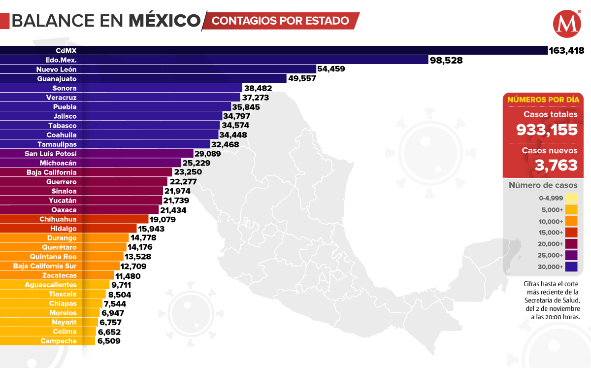 Mientras que Guanajuato es el estado que más casos aumentó la semana pasada, respecto a la anterior, con 533 contagios nuevos.