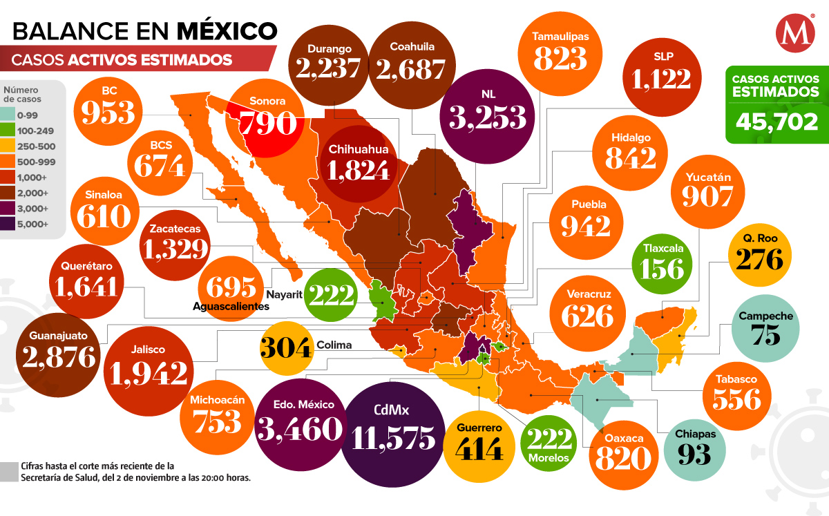 La Ciudad de México y el Estado de México son las entidades con mayor número de casos activos estimados de covid-19; mientras que Campeche tiene la menor cifra.