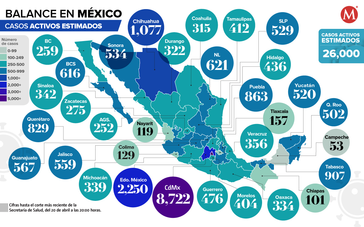 La Ciudad de México y el Estado de México son las entidades con la mayor cantidad de casos activos estimados de coronavirus; mientras que Campeche tiene la menor cifra.
