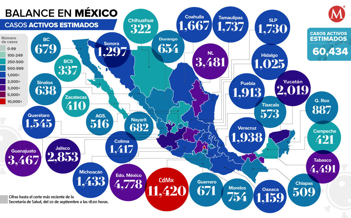 En contagios por estado, la Ciudad de México se mantiene en el primer puesto con 931 mil 634 contagios, seguido del Estado de México con 353 mil 951 y se agregó a Nuevo León con 192 mil 197, además de Guanajuato con 166 mil 197.