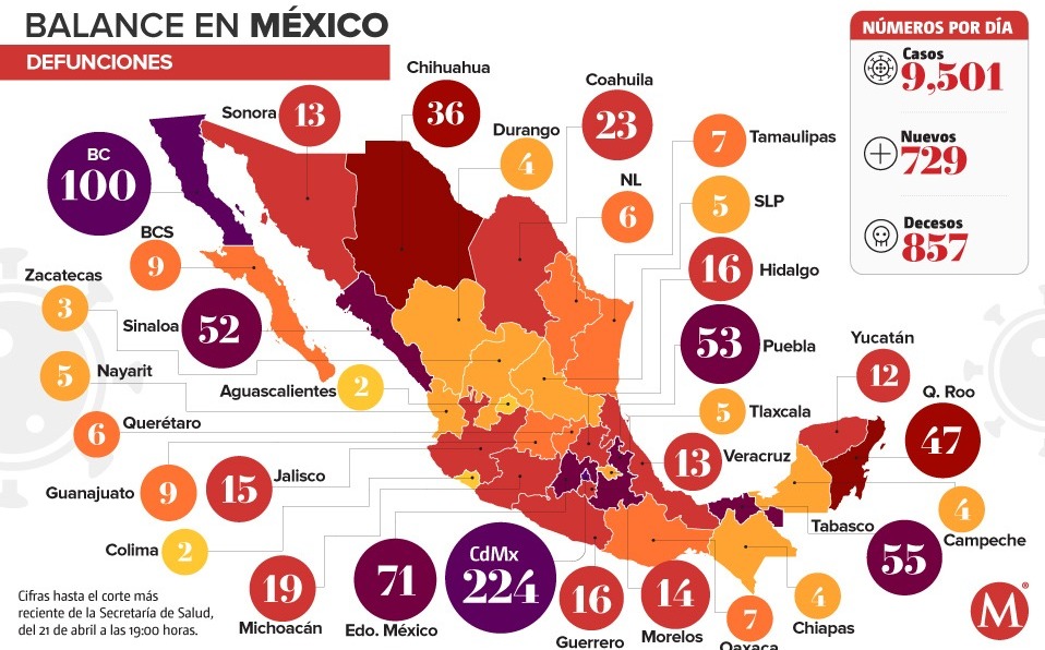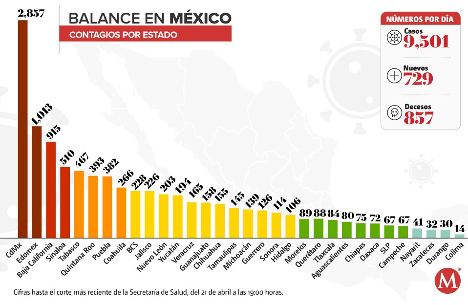 Luego de que ayer se reportó una disminución de los nuevos casos y defunciones en el país, hoy se reportaron 145 nuevas muertes y 729 casos detectados en las últimas 24 horas, con lo que suman 857 personas fallecidas y 9 mil 501 contagios acumulados de la enfermedad.