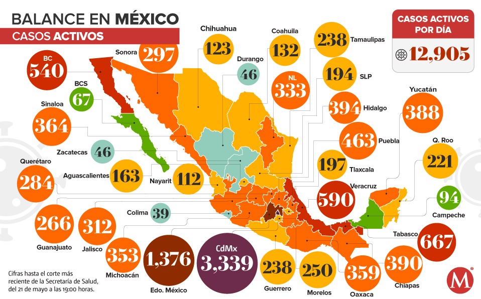 En tanto, Nuevo León, Durango, Zacatecas, Estado de México, Tlaxcala, y Tabasco disminuyeron casos activos; mientras que Tamaulipas es el único que ni aumento ni disminuyó el número de pacientes con síntomas.