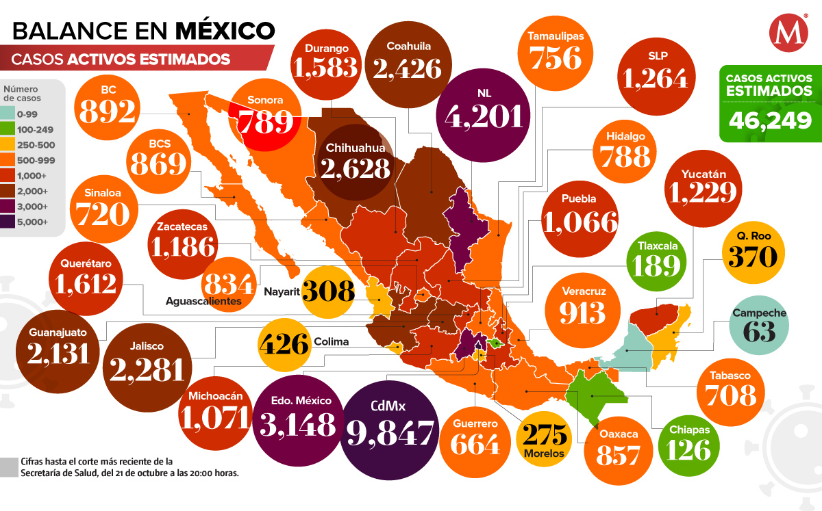En tanto, Baja California Sur tiene la mayor tasa de contagios activos, con 90 por cada 100 mil habitantes; mientras que mil 668.28 casos por cada 100 mil habitantes.