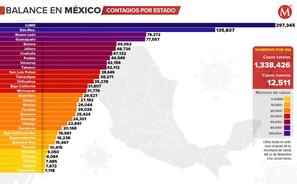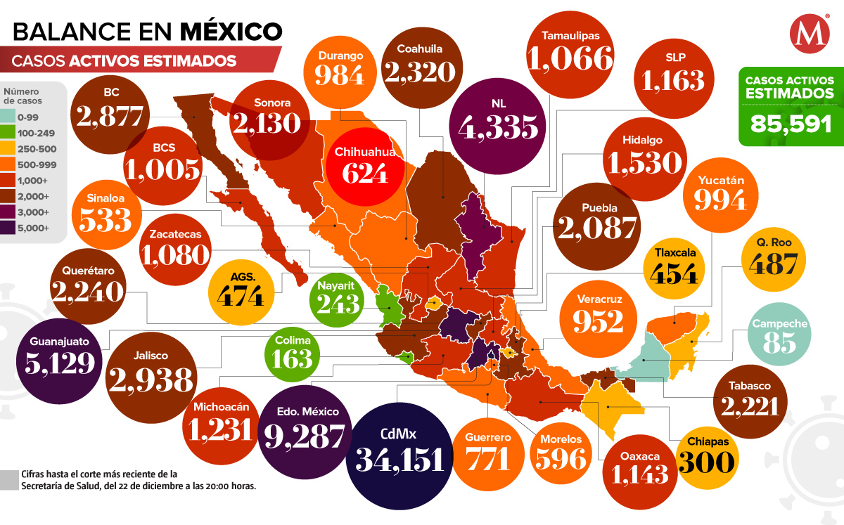 Baja California Sur es el estado con la mayor tasa de incidencia de casos activos, con 105.75 contagios por cada 100 mil habitantes. Mientras que la Ciudad de México tiene la mayor tasa acumulada, con 3 mil 297 casos por cada 100 mil habitantes.