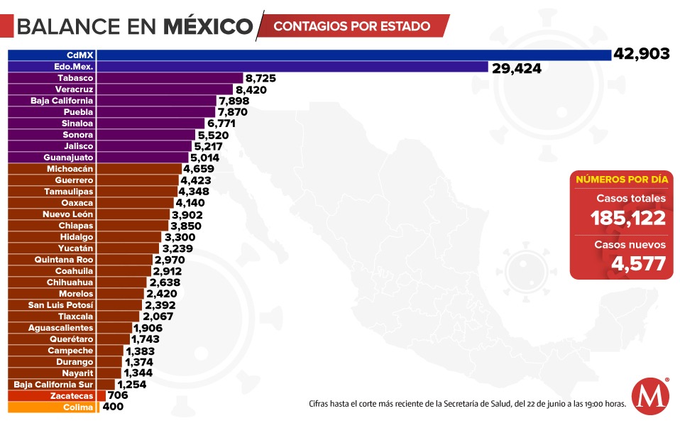 Respecto a los contagios acumulados, sólo Colima es la entidad que tiene menos de 500 casos reportados desde que inició la pandemia y junto con Zacatecas, son los únicos estados que tienen menos de mil resultados positivos registrados.