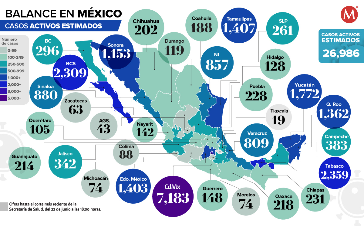 La Ciudad de México y Tabasco son las entidades con la mayor cantidad de casos activos estimados de coronavirus; mientras que Tlaxcala tiene la menor cifra.