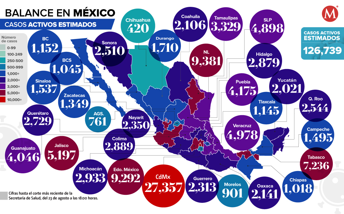 Además, la Ciudad de México registra 27 mil 357 casos activos estimados y el Estado de México 9 mil 292, con lo que se ubican como los estados con más casos activos.