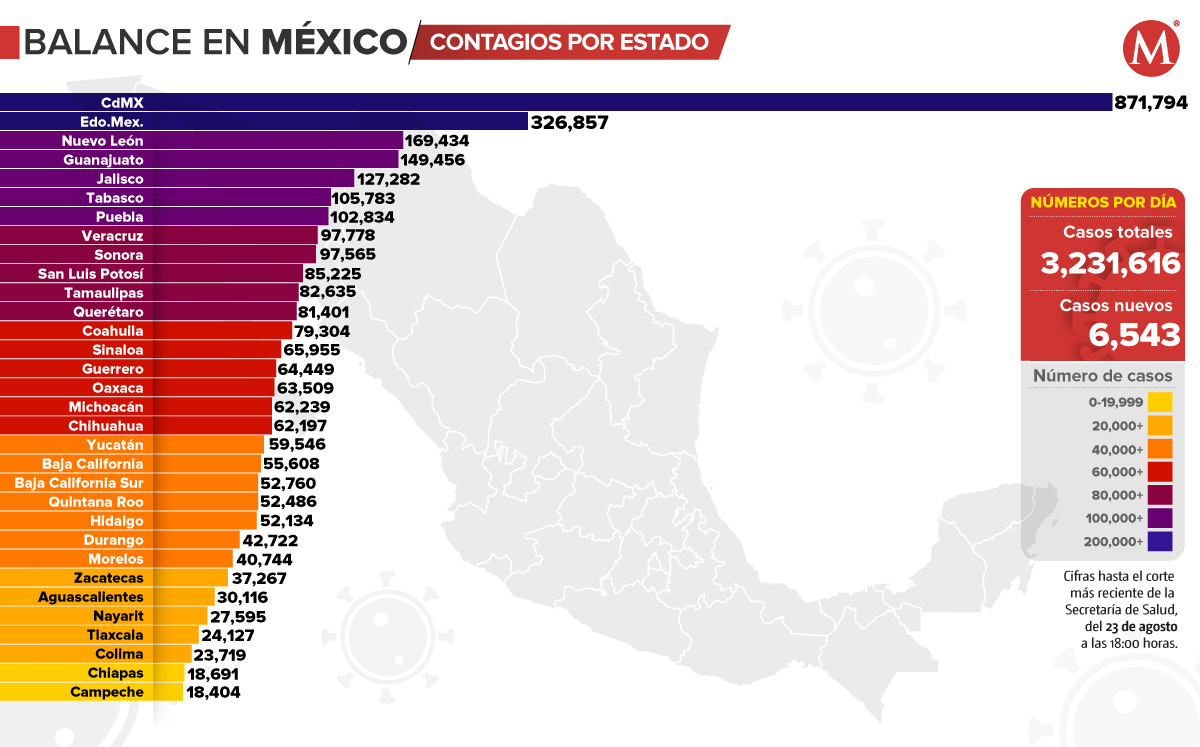 En contagios por estado, la Ciudad de México está en el primer lugar con 871 mil 794 casos, el Estado de México con 326 mil 857, Nuevo León con 169 mil 434 y Guanajuato con 149 mil 456.