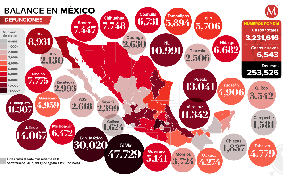 En todo el país se registran 253 mil 526 muertes por coronavirus. En las últimas 24 horas, Jalisco ha llegado a las 14 mil 067 defunciones, seguido de Puebla con 13 mil 041 y Veracruz con 11 mil 342, así como Guanajuato con 11 mil 307.
