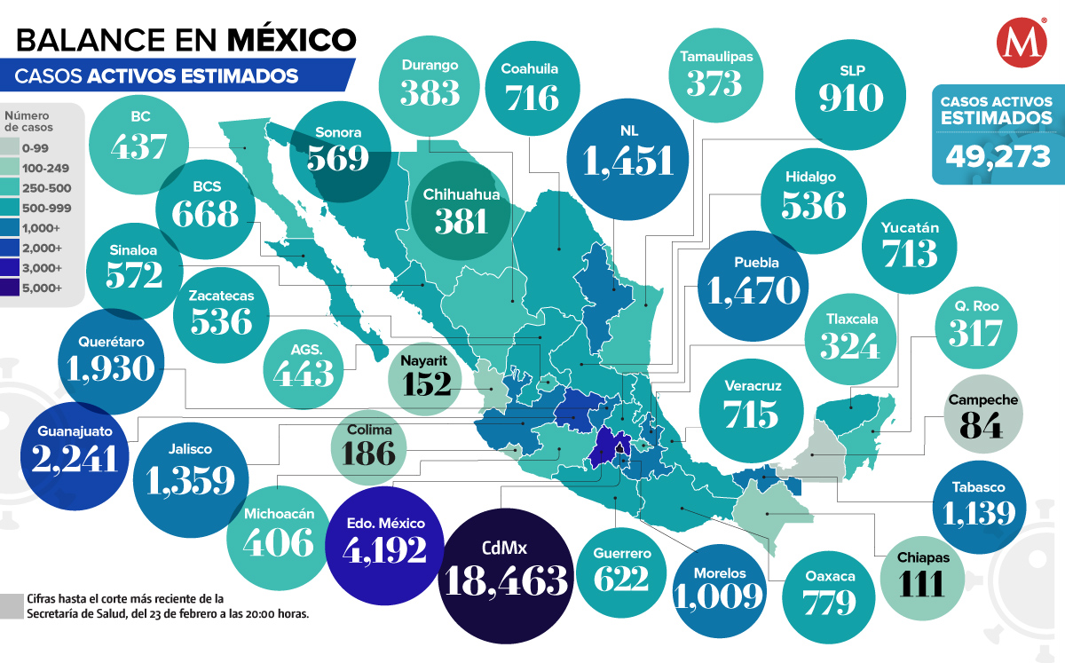 La Ciudad de México y el Estado de México son las entidades con mayor número de casos activos estimados; mientras que Campeche tiene la menor cifra.