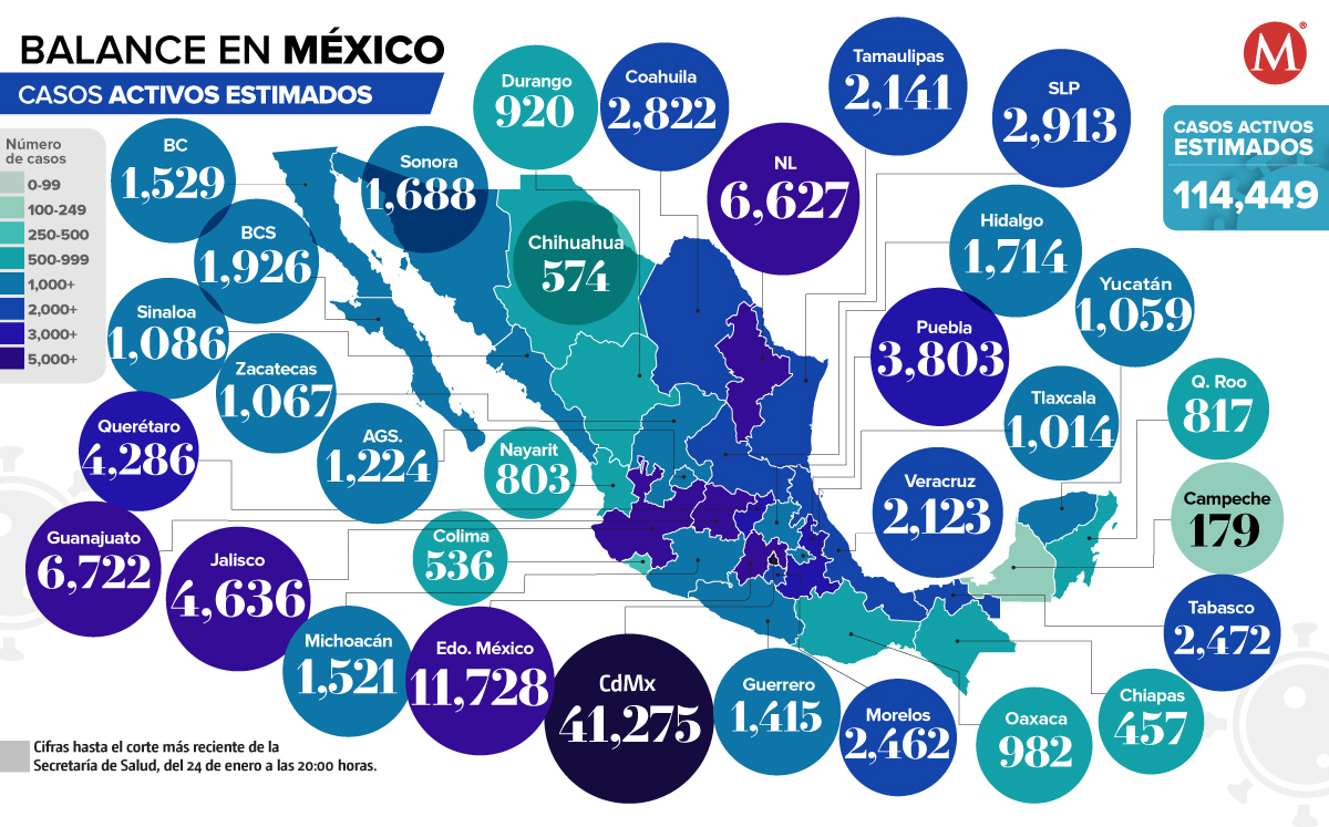 La Ciudad de México y el Estado de México son las entidades con mayor número de casos activos estimados de coronavirus; mientras que Campeche tiene la menor cifra.