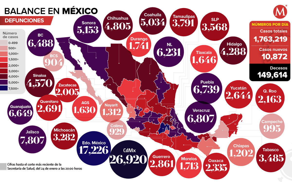La Ciudad de México y el Estado de México son las entidades con mayor número de muertes por coronavirus; mientras que Baja California Sur tiene la menor cifra.