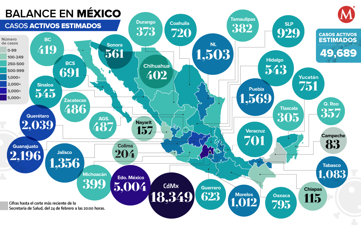 La Ciudad de México y el Estado de México son las entidades con mayor número de casos activos estimados y acumulados; mientras que Campeche tiene la menor cifra.