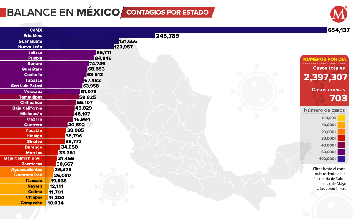 La Ciudad de México y el Estado de México son las entidades con la mayor cantidad de casos activos estimados de coronavirus; mientras que Tlaxcala tiene la menor cifra.