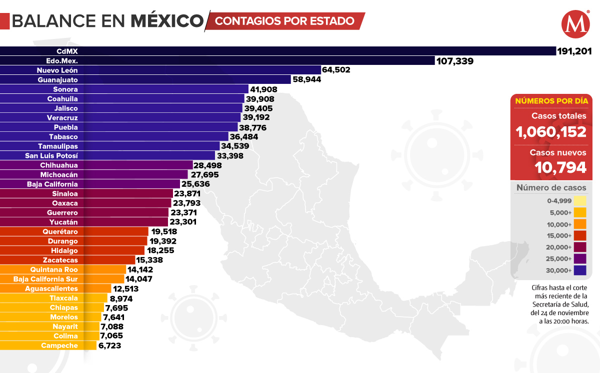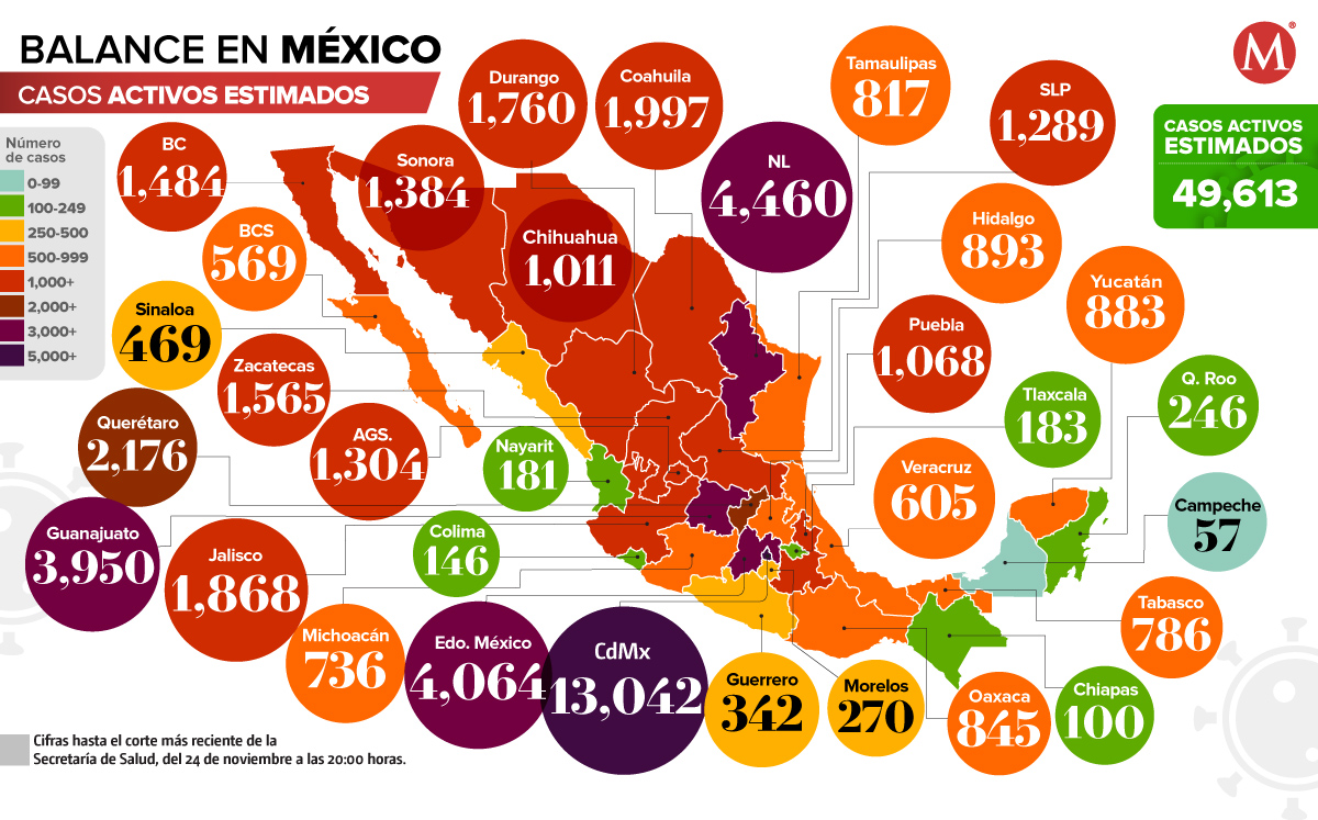 Durango es el estado con mayor tasa de casos activos de coronavirus, con 88.52 casos por cada 100 mil habitantes; mientras que la Ciudad de México tiene la mayor tasa acumulada con 2 mil 120.06 contagios por cada 100 mil habitantes.
