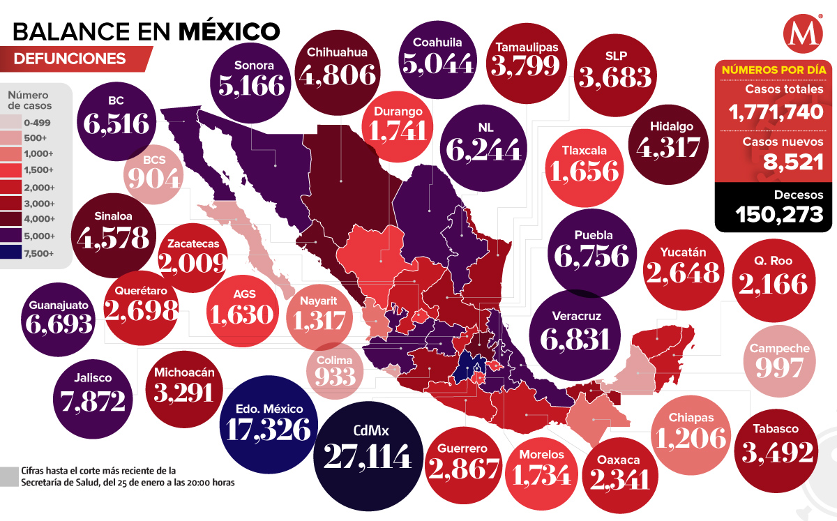 La Ciudad de México y el Estado de México son las entidades con mayor número de muertes por coronavirus en el país; mientras que Baja California Sur tiene la menor cifra.
