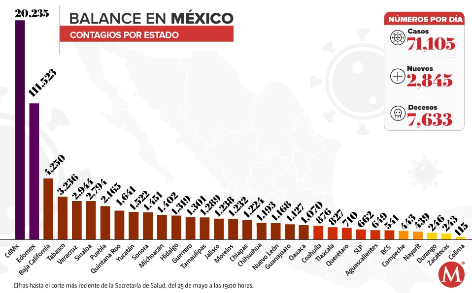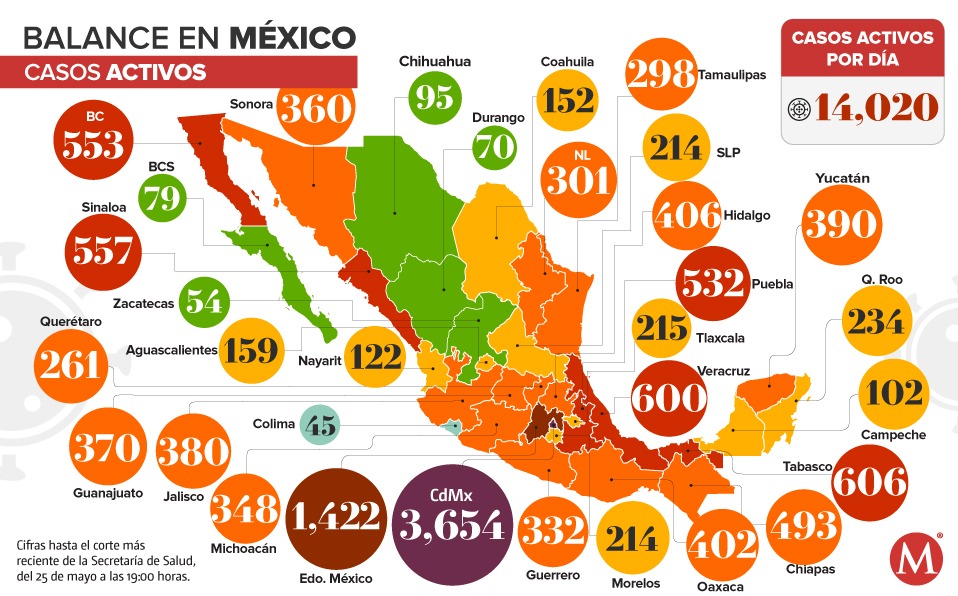 La Ciudad de México y el Estado de México siguen siendo las entidades con más casos de coronavirus en el país, aunque Tabasco, Sinaloa, Veracruz y Puebla han tenido un gran incremento de casos en los últimos días.