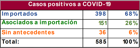 Además, de los casos confirmados 398 son importados, 151 son asociados a una importación y 36 no tuvieron antecedentes de viaje y se desconoce el origen de su contagio, lo que implica una aceleración de los contagios comunitarios, que ayer sumaban siete.