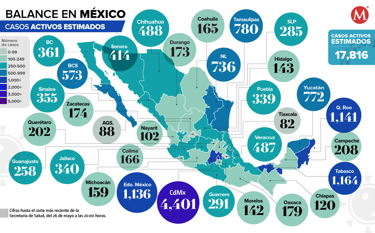 La Ciudad de México y el Estado de México son las entidades con la mayor cantidad de casos estimados de coronavirus; mientras que Tlaxcala tiene la menor cifra.