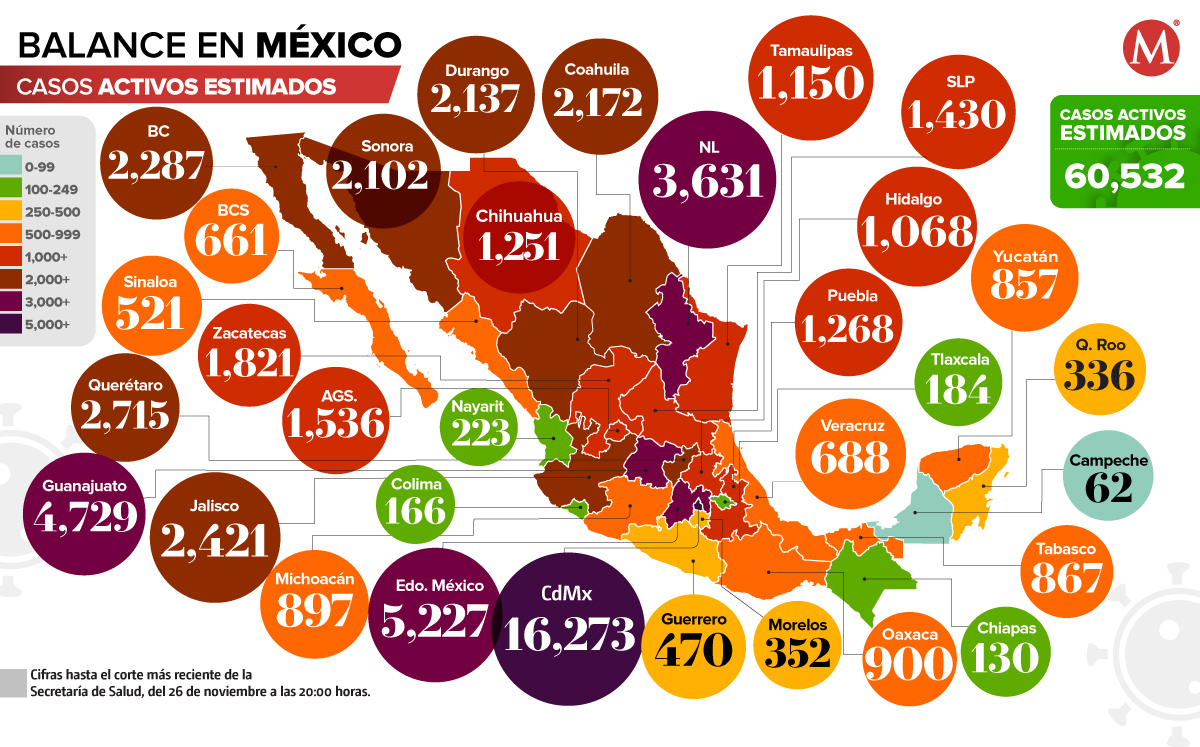 La Ciudad de México y el Estado de México son las entidades que más casos activos estimados tienen; mientras que Campeche es la entidad con menos pacientes y la única con menos de 100.