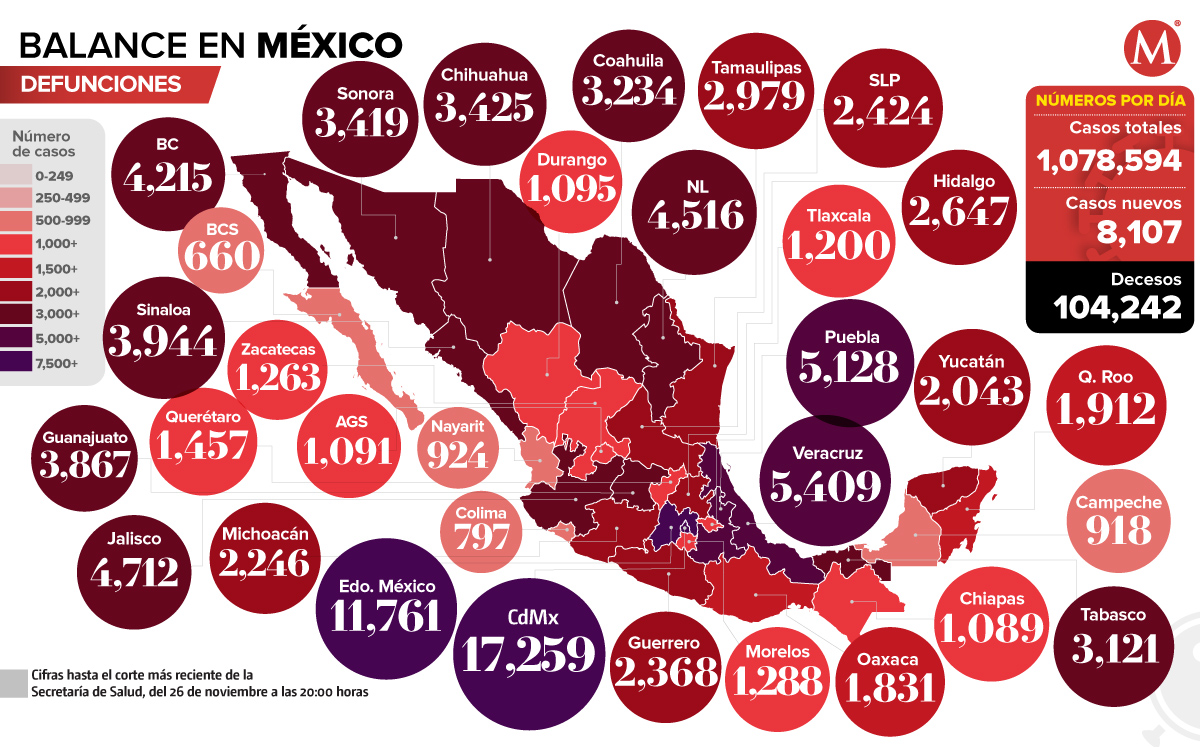 La Ciudad de México es la entidad del país donde hay mayor probabilidad de morir por covid-19, pues tiene la tasa de mortalidad más alta, con 133.26 defunciones por coronavirus por cada 100 mil habitantes, de acuerdo con datos de la Secretaría de Salud recogidos por la UNAM.