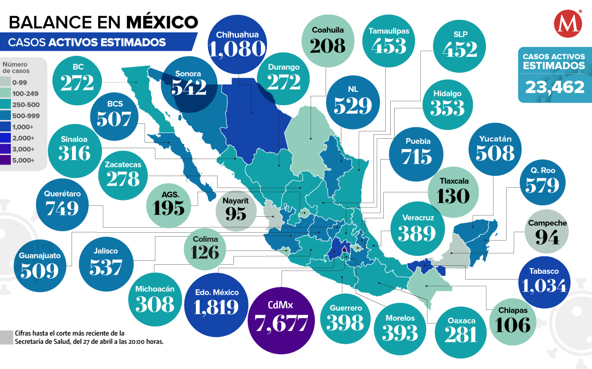 La Ciudad de México y el Estado de México son las entidades con la mayor cantidad de casos activos estimados de coronavirus; mientras que Campeche y Nayarit tienen la menor cifra.