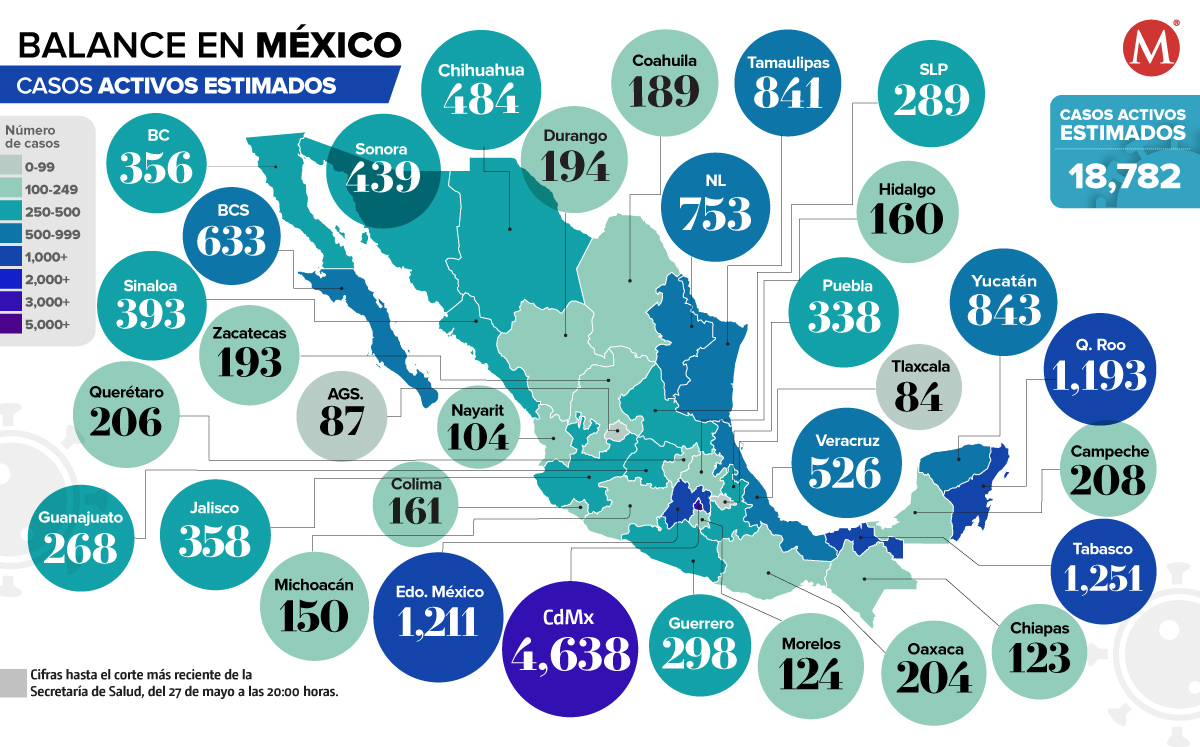 La Ciudad de México y el Estado de México son las entidades con la mayor cantidad de casos activos estimados de coronavirus en el país; mientras que Tlaxcala tiene la menor cifra.