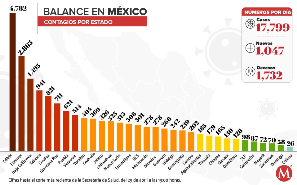La Secretaría de Salud reportó que en las últimas 24 horas se detectaron mil 47 nuevos casos de coronavirus y murieron 163; para dar un total de 17 mil 799 contagios y mil 732 defunciones, de las cuales 152 han sido sólo en el municipio de Tijuana.