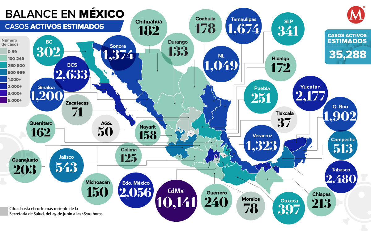 La Ciudad de México y el Estado de México son las entidades con la mayor cantidad de casos activos estimados de coronavirus; mientras que Tlaxcala tiene la menor cifra.