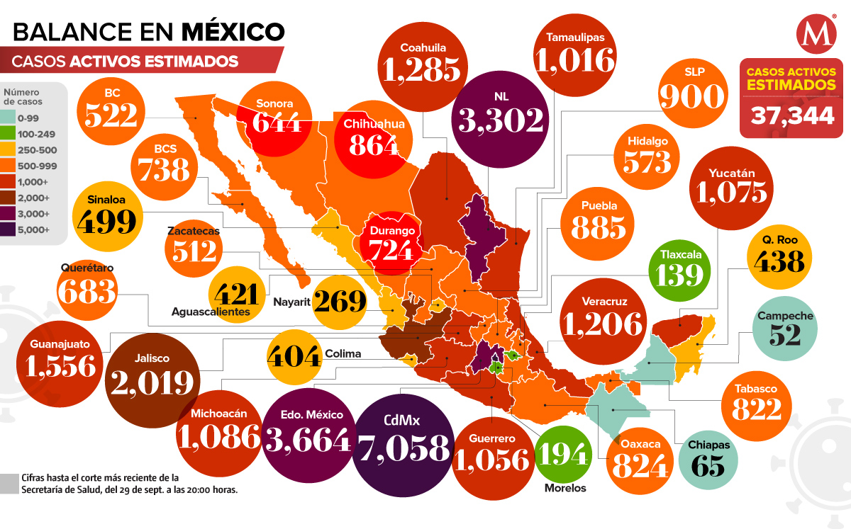 De acuerdo con datos de la Secretaría de Salud, recogidos por la UNAM, Baja California Sur tiene la mayor incidencia de casos activos, con 89.35 casos por cada 100 mil habitantes; mientras que la Ciudad de México tiene la mayor tasa acumulada, con mil 387 casos por cada 100 mil habitantes.