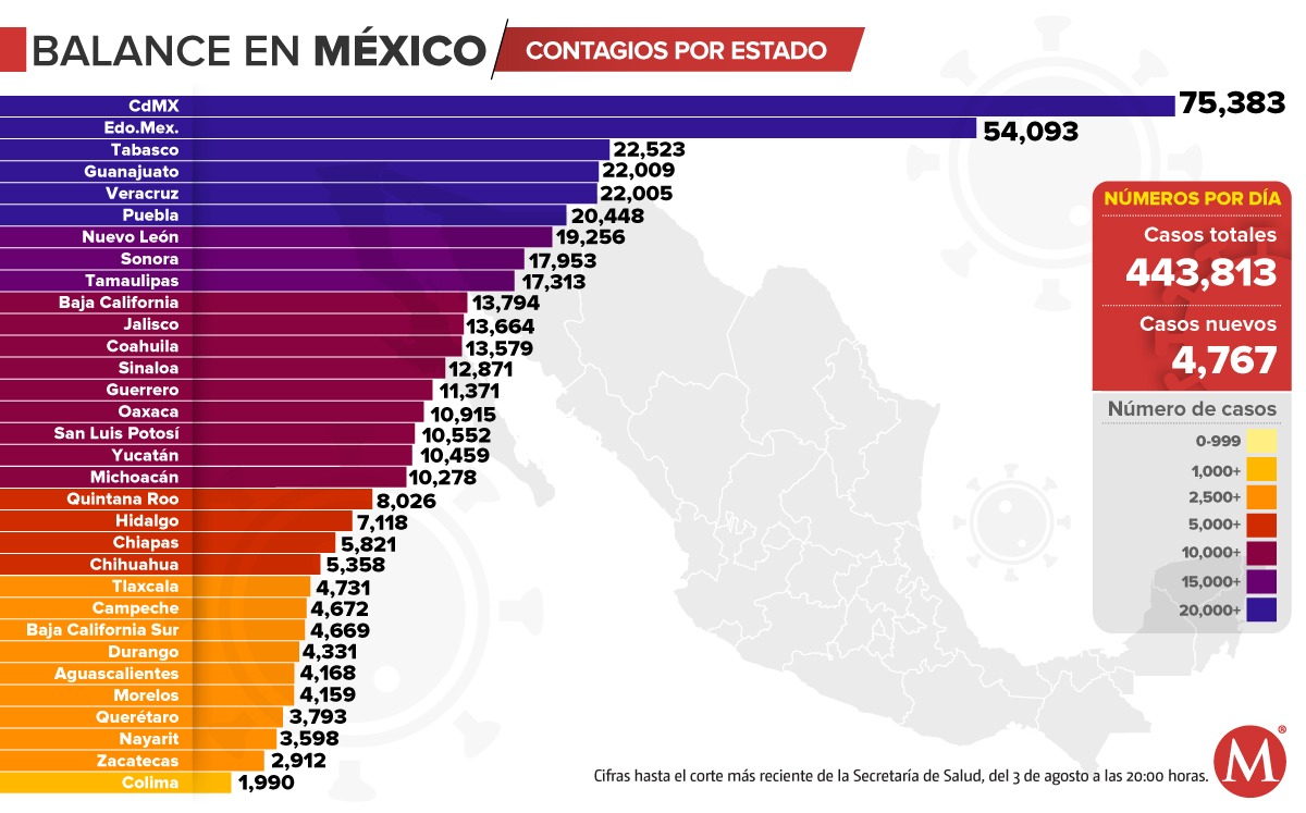 La dependencia informó que en el país se han confirmado 443 mil 8136 personas con covid-19, aunque estima que hay alrededor de 480 mil 645 contagios, lo que quiere decir que aproximadamente 36 mil 832 contagiados no han sido detectados.