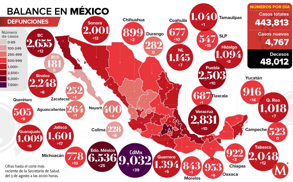 En el país, seis estados han acumulado más de 2 mil defunciones por coronavirus, encabezados por la Ciudad de México y el Estado de México.