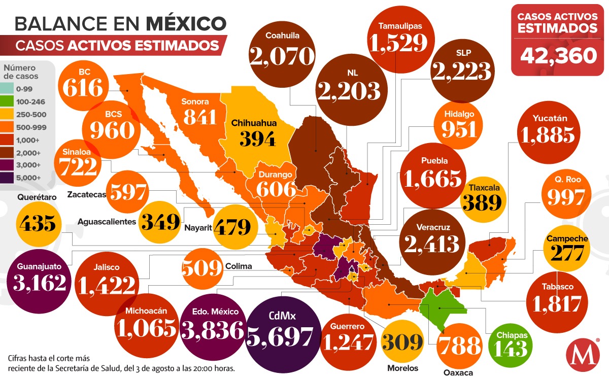 En tanto, actualmente hay 28 mil 741 pacientes con síntomas de la enfermedad que se contagiaron en los últimos 14 días, aunque estima que habría aproximadamente 42 mil 360 casos activos en México.
