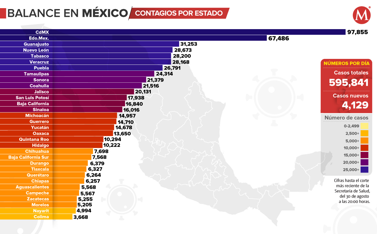 La Ciudad de México, el Estado de México, Nuevo León y Guanajuato son los estados con más casos activos estimados; mientras que Chiapas y Campeche son los estados con menos casos.