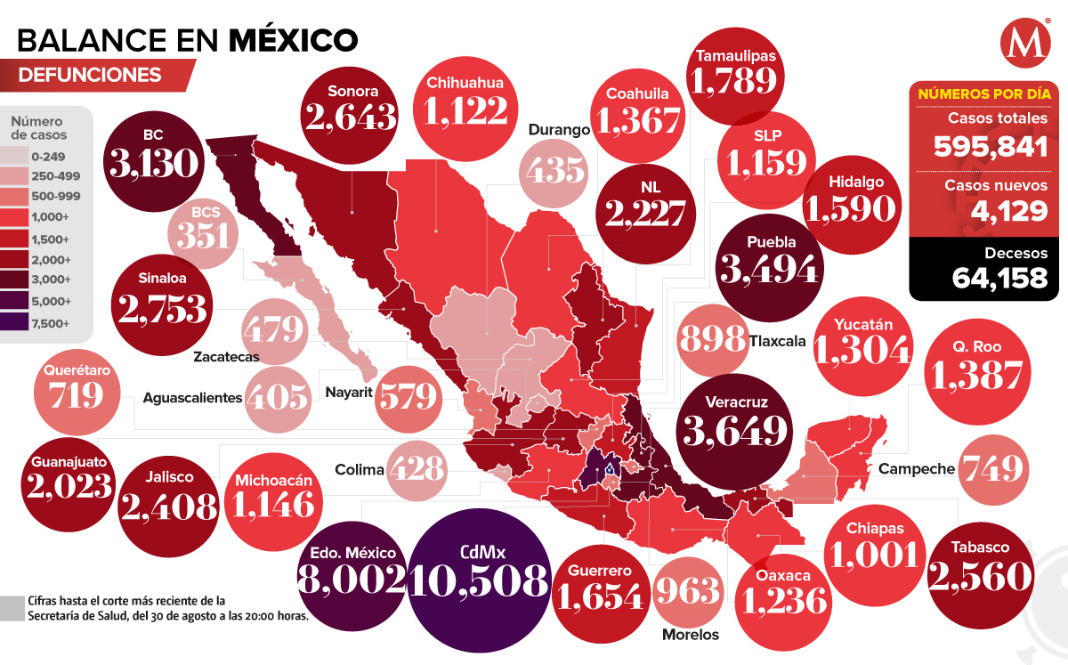 La Ciudad de México y el Estado de México son los estados con más muertes por coronavirus. Mientras que Baja California Sur es la entidad con menos defunciones.