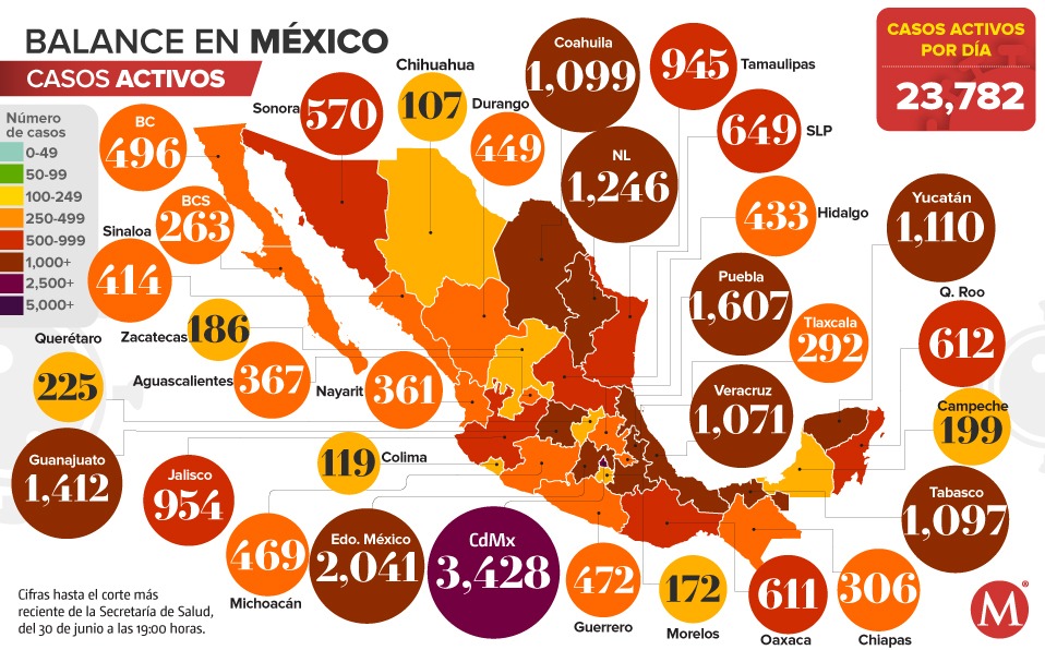 En las últimas 24 horas se reportó una disminución de los casos activos en Sonora, Tamaulipas, Colima, Michoacán, Veracruz, Ciudad de México, Puebla, Morelos, Tabasco y Campeche.
