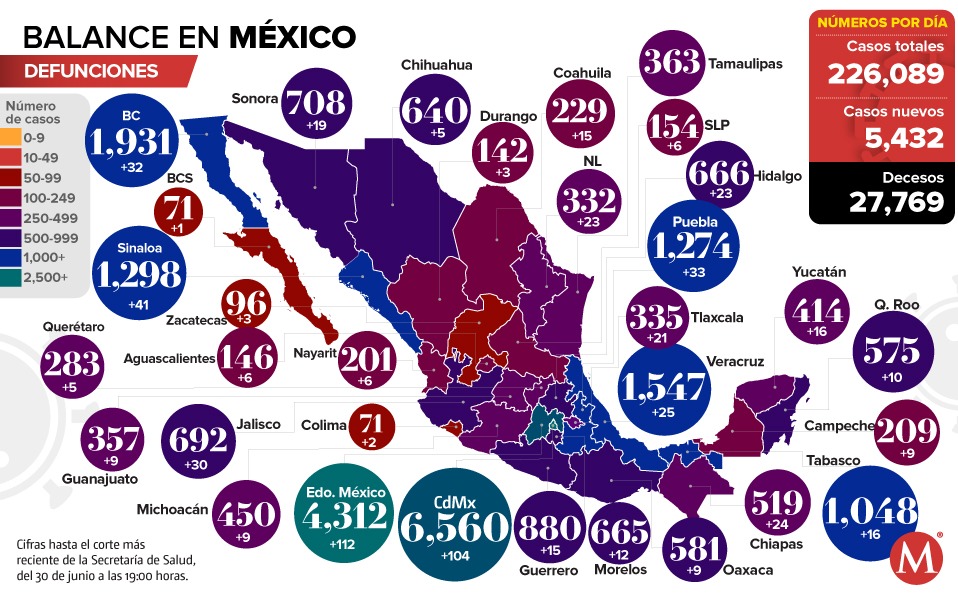 La Secretaría de Salud reporta que siete estados han registrado más de mil muertes por covid-19; mientras que sólo tres tienen menos 100.