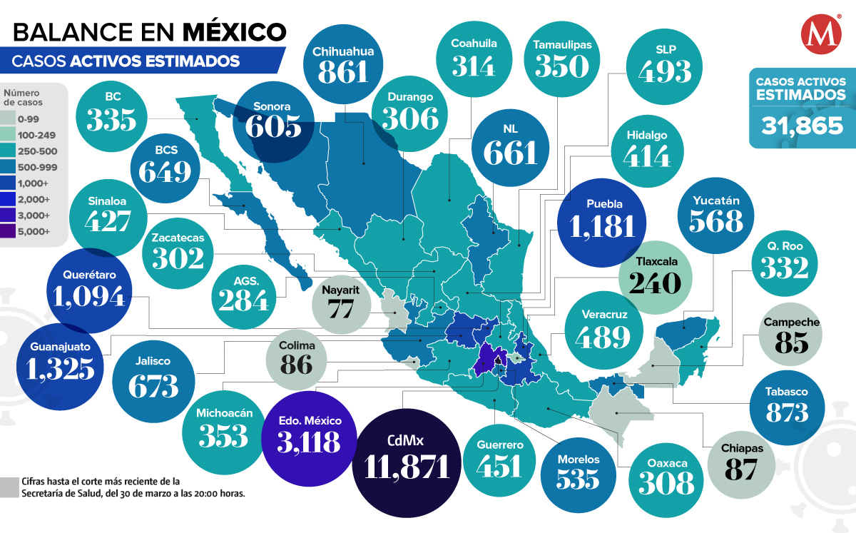 La Ciudad de México y el Estado de México son las entidades con la mayor cantidad de casos estimados de coronavirus; mientras que Nayarit y Campeche tienen la menor cifra.