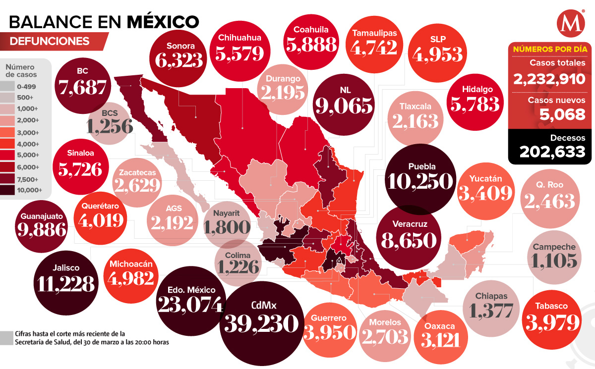 La Ciudad de México y el Estado de México son las entidades con la mayor cantidad de muertes por covid-19; mientras que Campeche tiene la menor cifra.