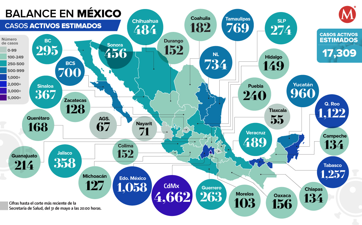 La Ciudad de México y el Estado de México son las entidades con la mayor cantidad de casos activos estimados de coronavirus; mientras que Tlaxcala tiene la menor cifra.