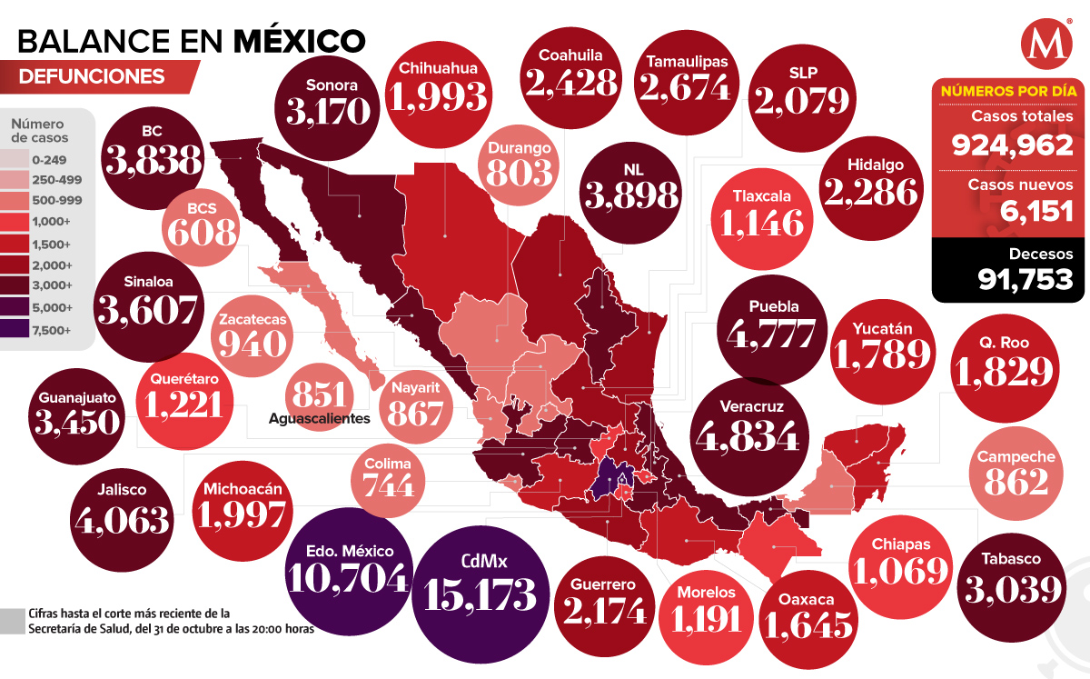 La Ciudad de México y el Estado de México son las entidades que más muertes han reportado por coronavirus; mientras que Baja California Sur tiene la menor cantidad de muertes con 608.