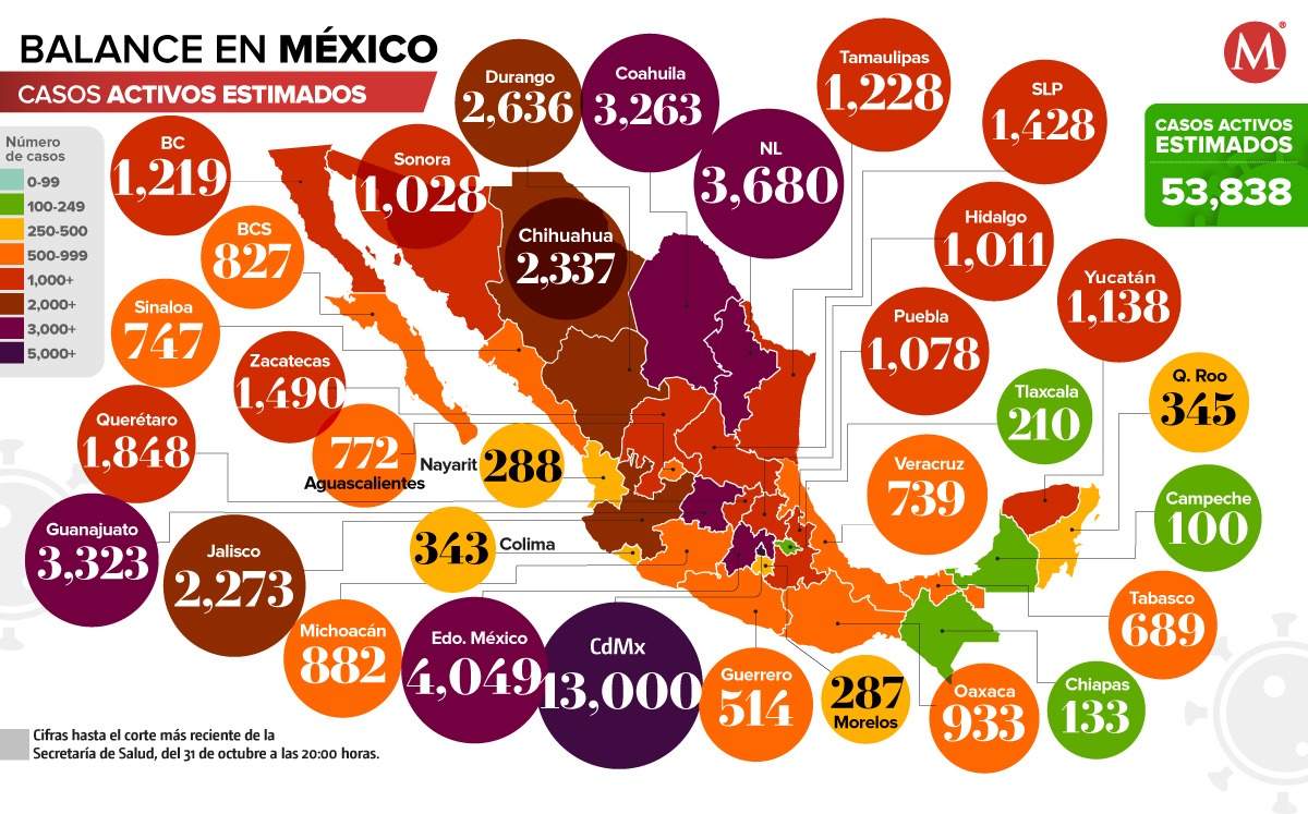Ciudad de México, Estado de México, Nuevo León, Guanajuato y Coahuila son los cinco estados con más activos de covid-19 en el país, la enfermedad que ha provocado miles de muertes en todo el mundo.