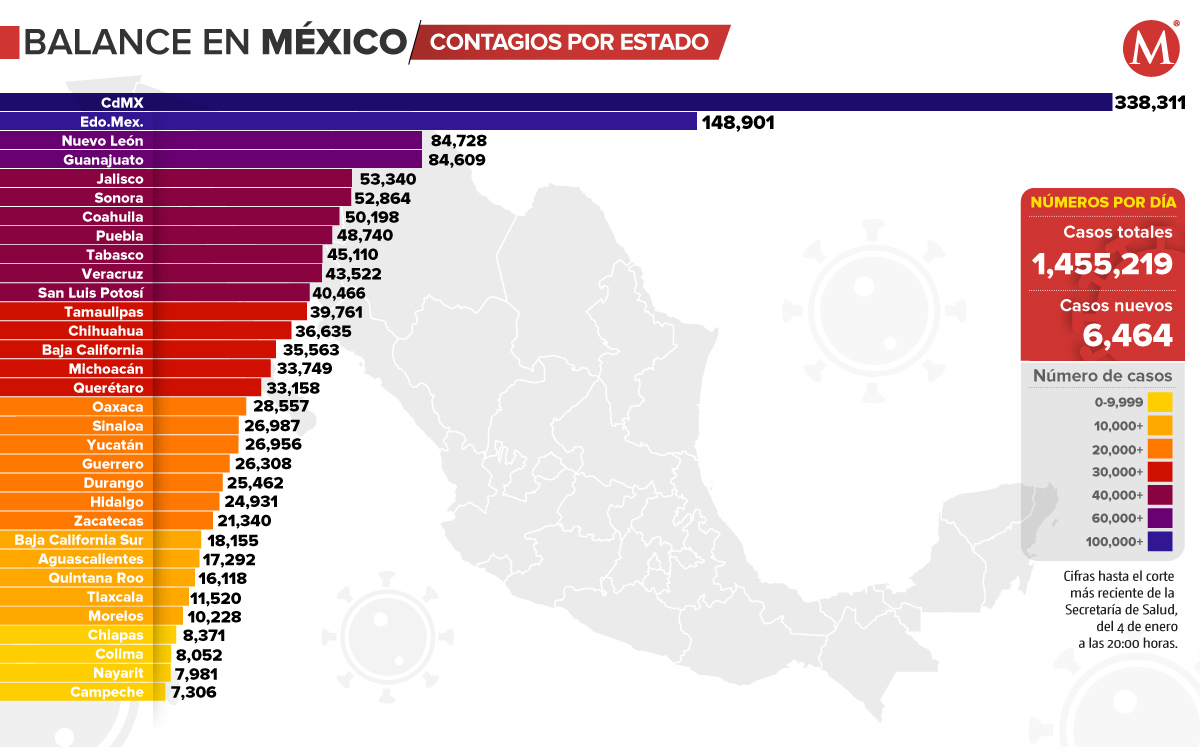 Baja California Sur es la entidad con mayor incidencia de casos activos de coronavirus, con 131.72 por cada 100 mil habitantes; mientras que la ciudad de México tiene la mayor tasa acumulada, con 3 mil 751.24 contagios por cada 100 mil habitantes.