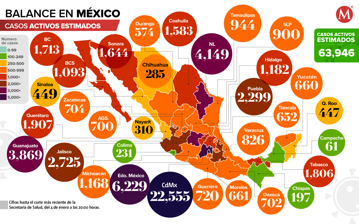 La Ciudad de México y el Estado de México son las entidades que mayor número de casos activos estimados tienen; mientras que Campeche tiene la menor cifra.