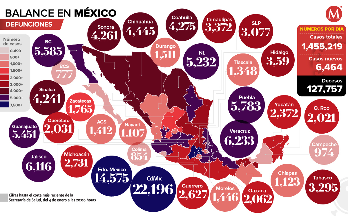 La Ciudad de México y el Estado de México son las entidades con mayor número de muertes por covid-19; mientras que Baja California Sur tiene la menor cifra de defunciones.