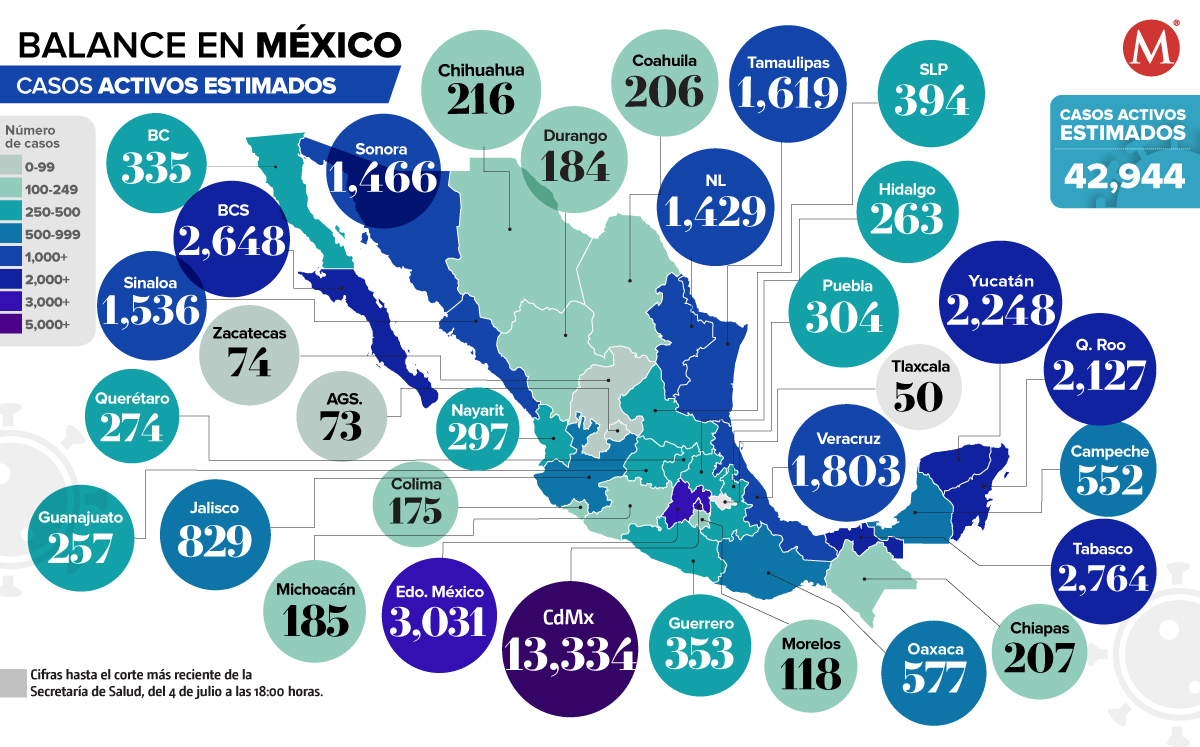 La Ciudad de México y el Estado de México son las entidades con la mayor cantidad de casos activos de coronavirus; mientras que Tlaxcala tiene la menor cifra.