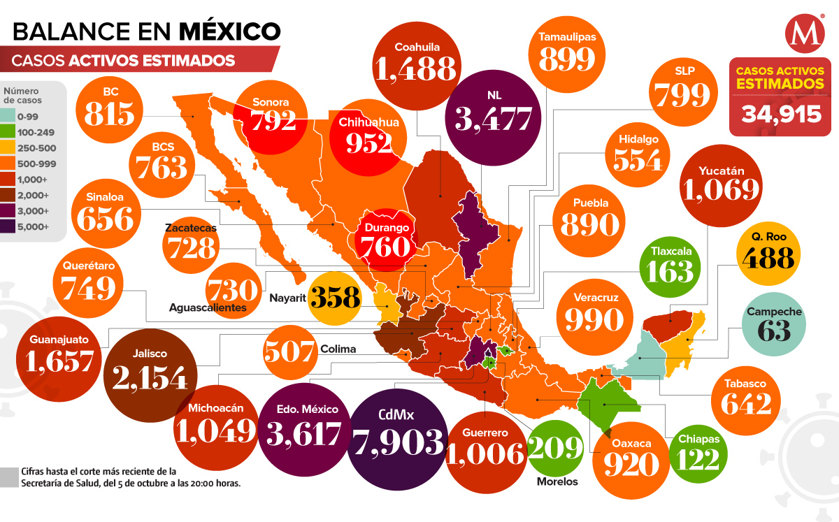 Además, la Secretaría de Salud estima que hay alrededor de 34 mil 914 personas que aún tienen la enfermedad covid-19, aproximadamente, que representan 4 por ciento del total de contagios en el país.