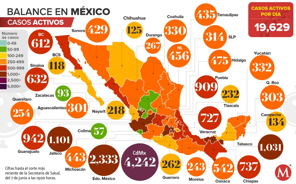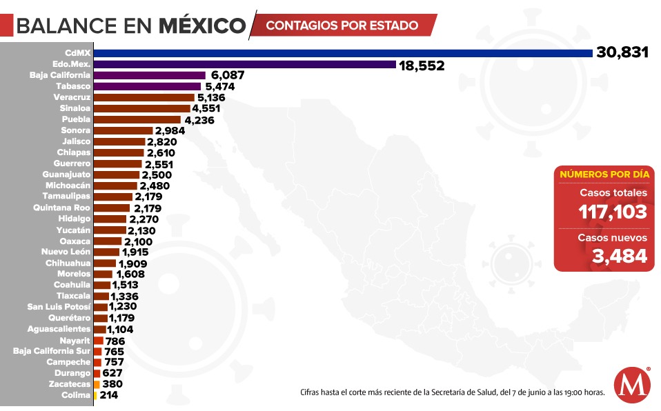 La Ciudad de México, el Estado de México y Baja California son las únicas entidades que tienen más de mil defunciones; aunque siete estados han reportado más de 500 muertes.