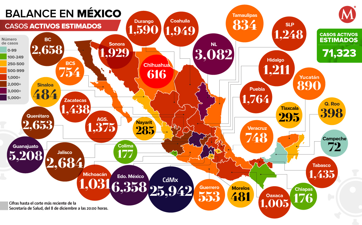La Ciudad de México, el Estado de México y Guanajuato son los estados con mayo número de casos activos estimados de coronavirus; mientras que Campeche es la entidad con menor número de contagios.