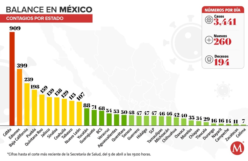 La capital del país, el Estado de México y Baja California son las únicas entidades que han superado los 200 casos; mientras que siete estados tienen entre 100 y 199 contagios; mientras que el resto de las entidades tiene menos de 100 infectados.